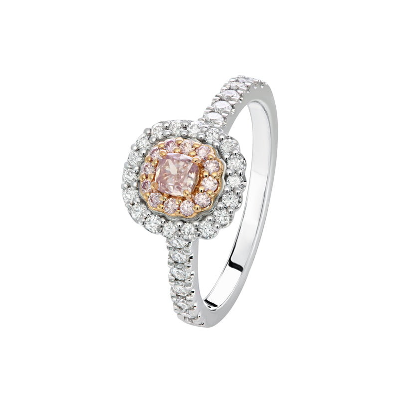 The Kimberley Madeleine Ring is classy and luxurious. Featuring a beautiful cushion cut pink diamond from the Argyle mine, surrounded by a double halo of sparkling diamonds, this piece makes the perfect engagement ring to treasure for a lifetime! This ring has been crafted in 18ct white and rose gold.