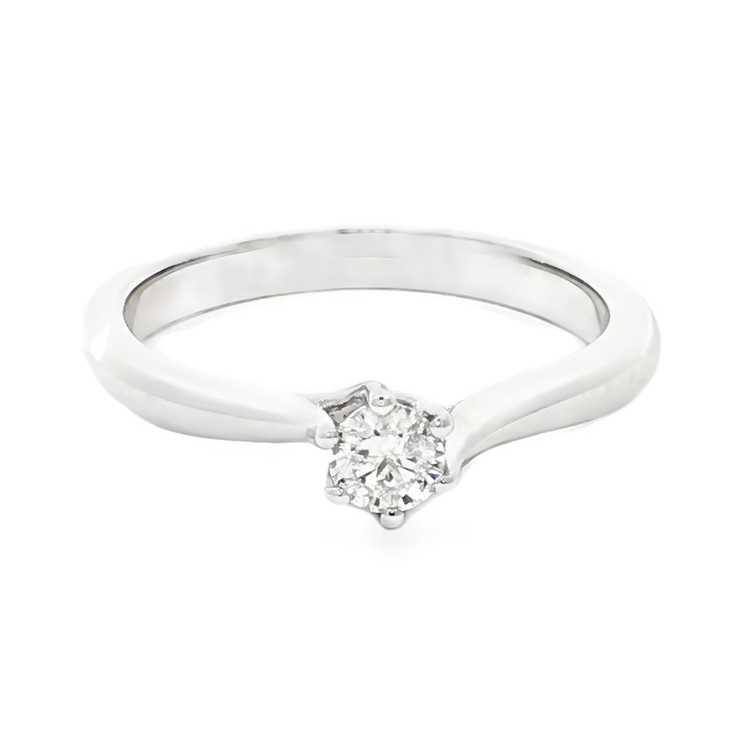 Crafted in luminous 18ct white gold, this solitaire ring showcases a brilliant 0.25ct white diamond in a refined six-claw twist setting—designed to elevate the stone’s natural sparkle while adding a contemporary flourish. Graded HI/P1, the diamond offers a warm glow and unique character, making each ring truly one of a kind.