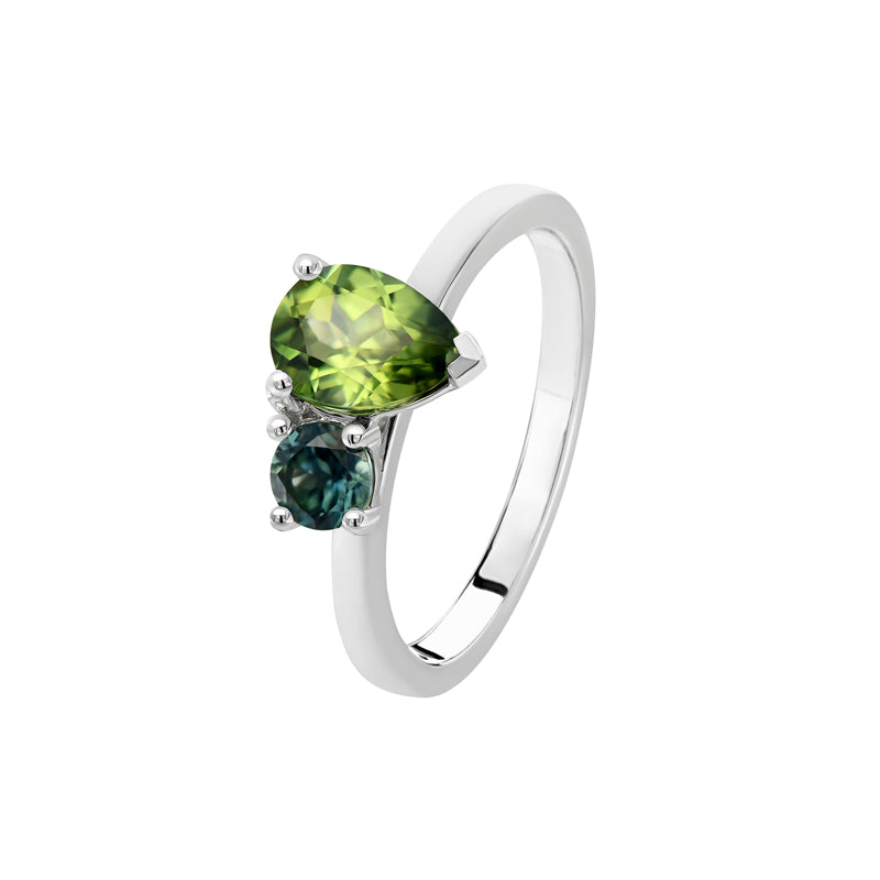 This refined dress ring from the Lulu Collection showcases a striking 1.02ct pear-cut green sapphire, certified by Sapphire Dreams (SD Certificate: 02817), paired with a brilliant 0.33ct round blue sapphire. Set in luminous 9ct white gold, the contrasting hues evoke the lush landscapes and coastal depths of Australia—where each natural sapphire is responsibly sourced.