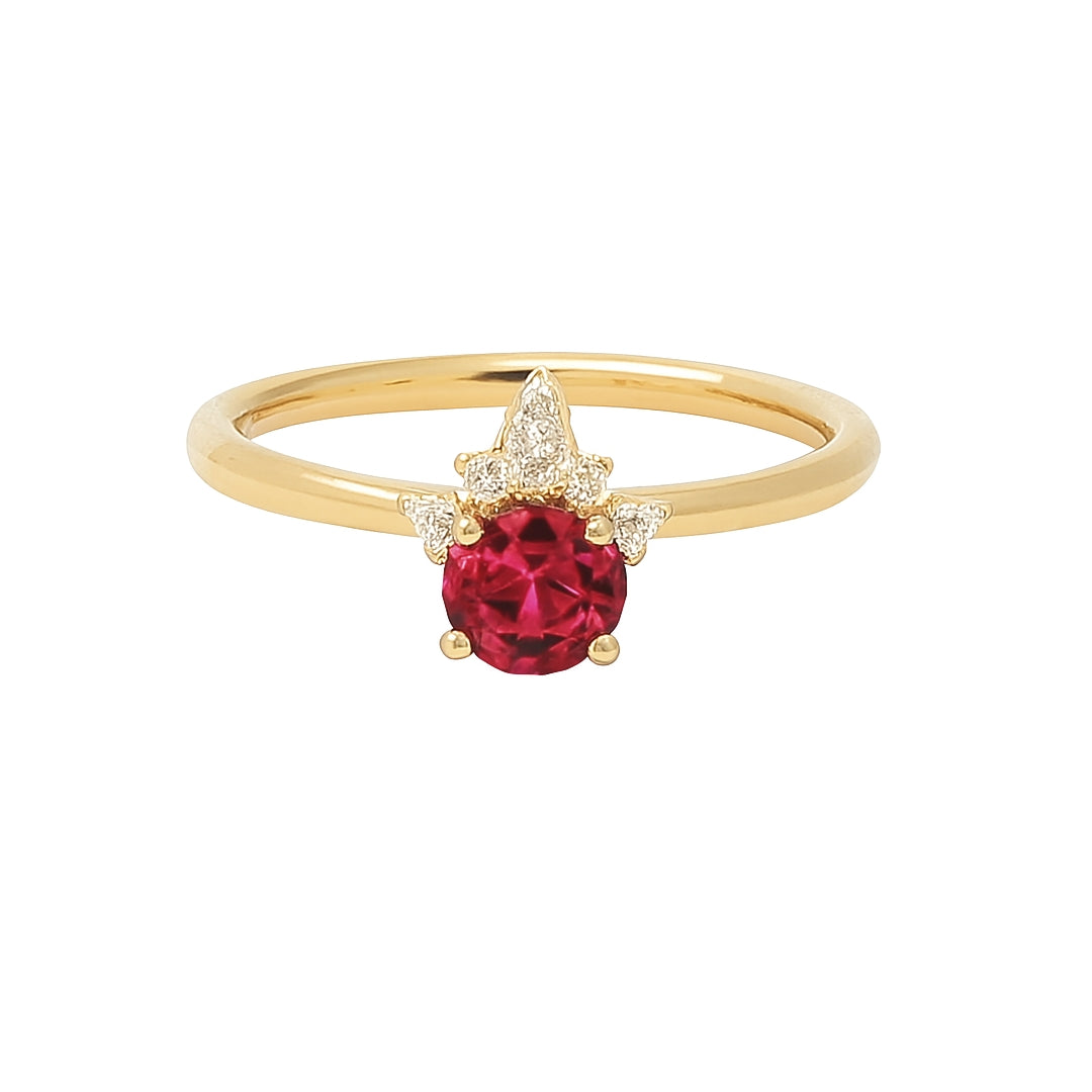 A radiant celebration of passion and elegance, this 9ct yellow gold ring showcases a captivating 4.50mm round ruby of exceptional Grade E quality, weighing approximately 0.46ct. Accented by four smaller rubies (0.04ct total) and a delicate 0.06ct ruby, the design evokes timeless romance and refined artistry. Five brilliant-cut diamonds (TDW approx. 0.10ct) lend a subtle sparkle, enhancing the warmth of the gold and the richness of the rubies. Perfectly balanced between heritage and modern allure, this piece is a testament to enduring beauty.