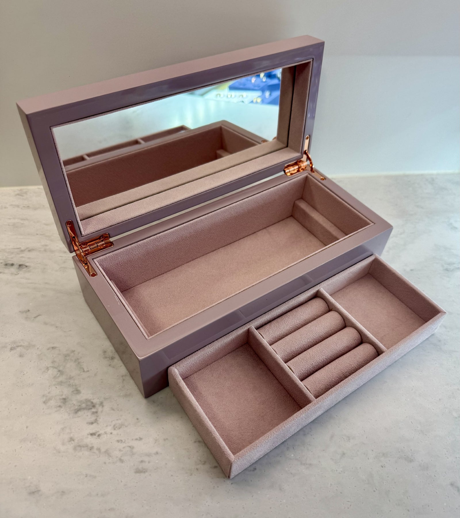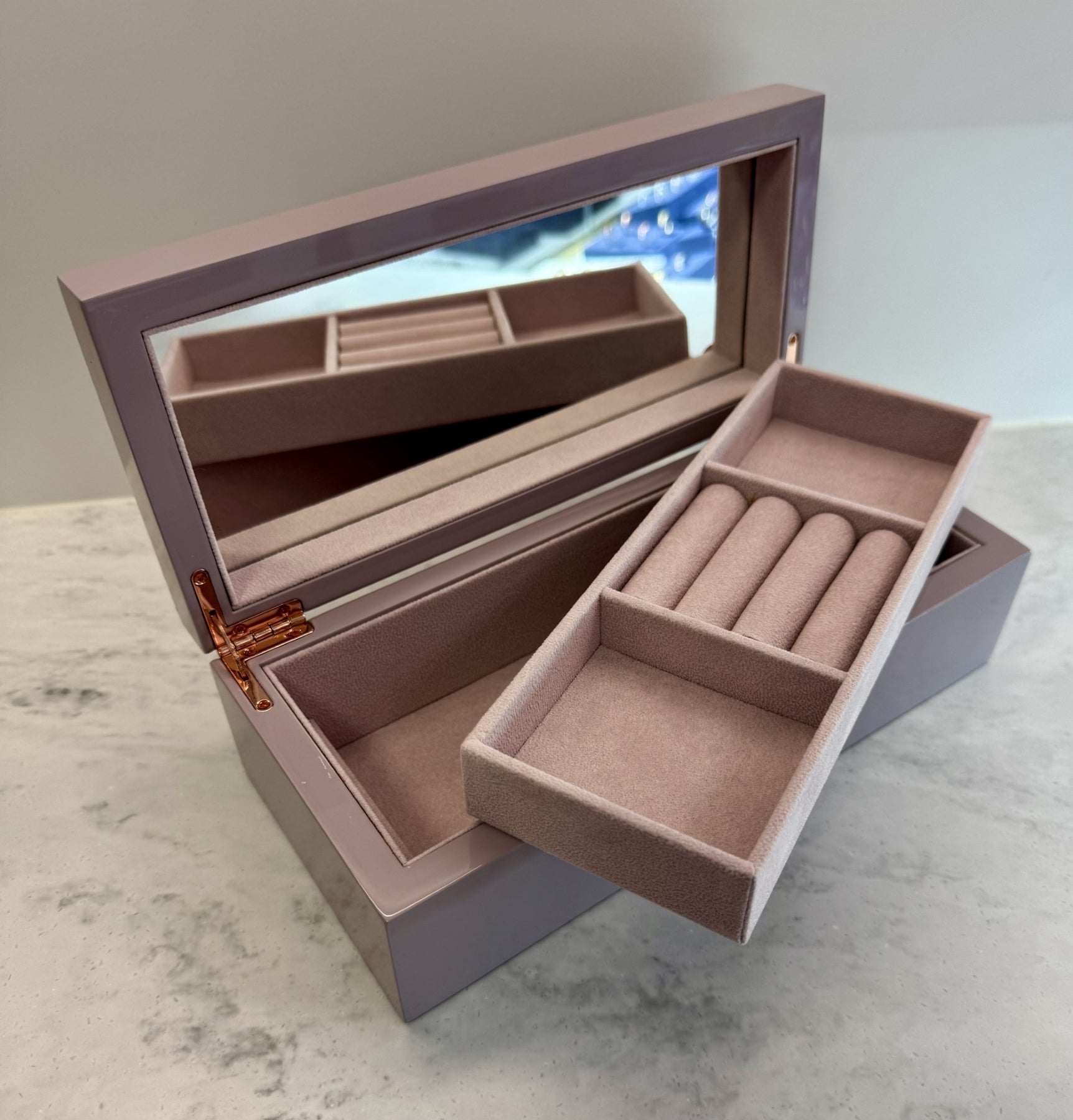 LILAC – Jewel Box (Small Rectangle) Dimensions: 260 × 118 × 80 mm Elevate your everyday elegance with the LILAC Jewel Box — a compact sanctuary for your treasured pieces. Cloaked in a glossy lavender finish, this small rectangular box opens to reveal a soft beige velvet interior, thoughtfully designed to cradle rings, earrings, and keepsakes with care. The hinged lid features a rectangular mirror for effortless styling, while the removable tray offers padded rolls and versatile compartments to organize your collection with grace. Whether gifted or kept, it’s a timeless companion that blends beauty with function — perfect for dressing tables, travel, or heartfelt moments. Design No: WJ34LILAC