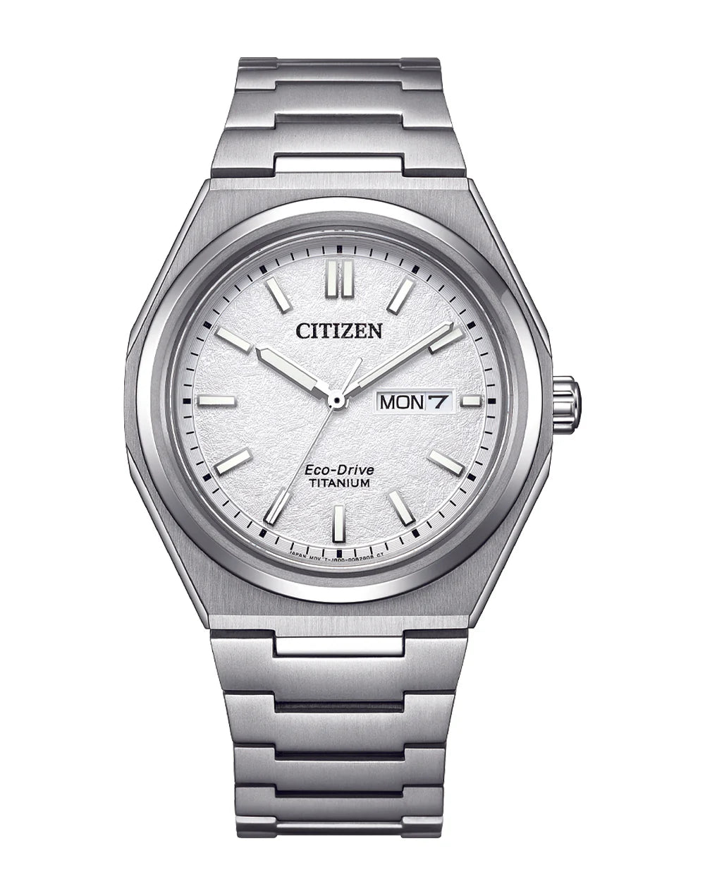 KEY FEATURES Introducing the Zenshin collection, where timeless design meets modern innovation. Built with Super Titanium™, a proprietary material that’s five times harder and 40% lighter than stainless steel, this 39mm silver-tone watch is both scratch- and rust-resistant, offering unmatched durability. Its sleek design is complemented by polished and brushed finishes, along with an integrated bracelet for effortless style. The textured white dial features a bold black minute ring, luminous hands, and markers for enhanced legibility, while a retro-inspired day-date display at 3 o’clock adds practicality. Powered by light with Eco-Drive technology, this watch never requires a battery and is water-resistant up to 100 meters—delivering both functionality and elegance. Collection - Super Titanium. Technology - Eco-Drive. Case Material - Super Titanium. Dial - Silver. Case Size (MM) - 39. Band - Titanium Bracelet, Push Button Buckle. Glass - Sapphire Crystal. Water resistance - WR100/10Bar [Swimming / Snorkeling]. Functions - Calibre J800, 3-hand, 12/24 hr Time, Day & Date, 8-month power reserve. 5 Year Limited Warranty. Design No: AW0130-85A