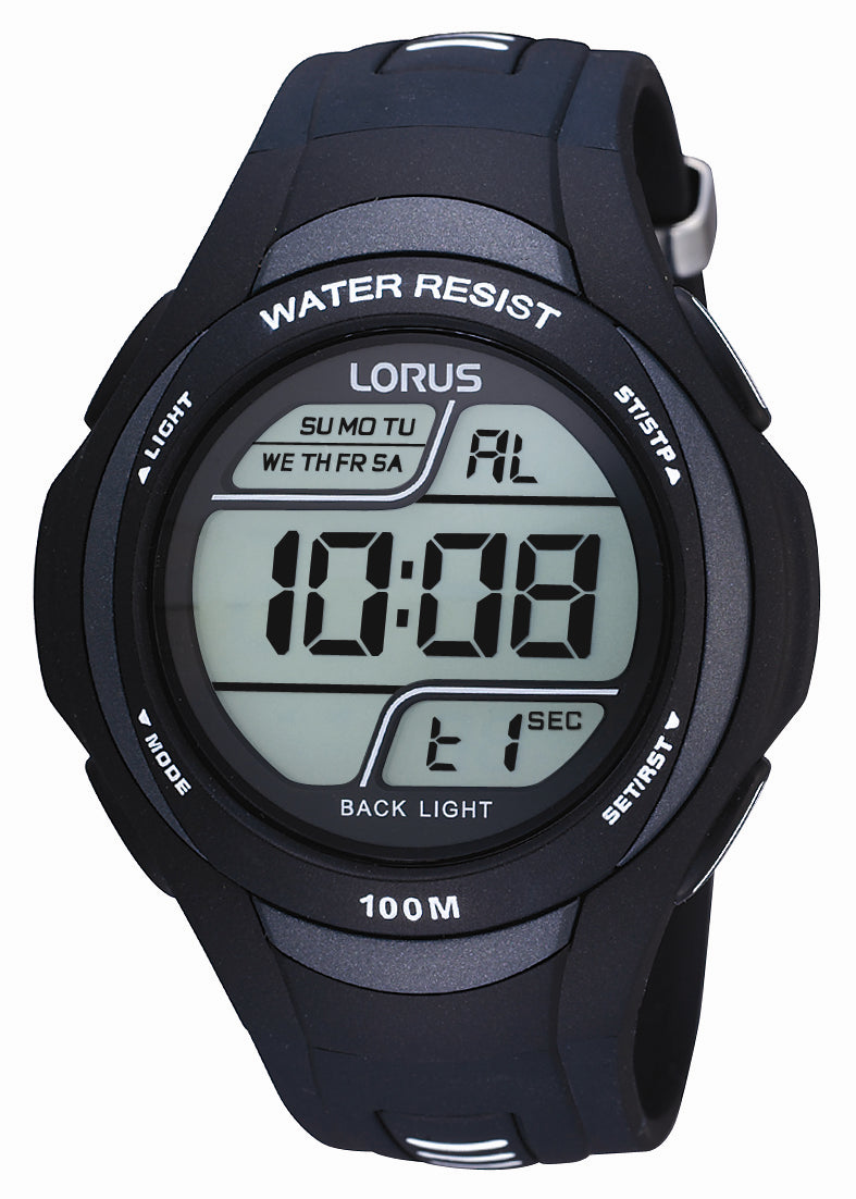 The Lorus R2305EX-9 is a sporty digital watch designed for both function and durability. It features: