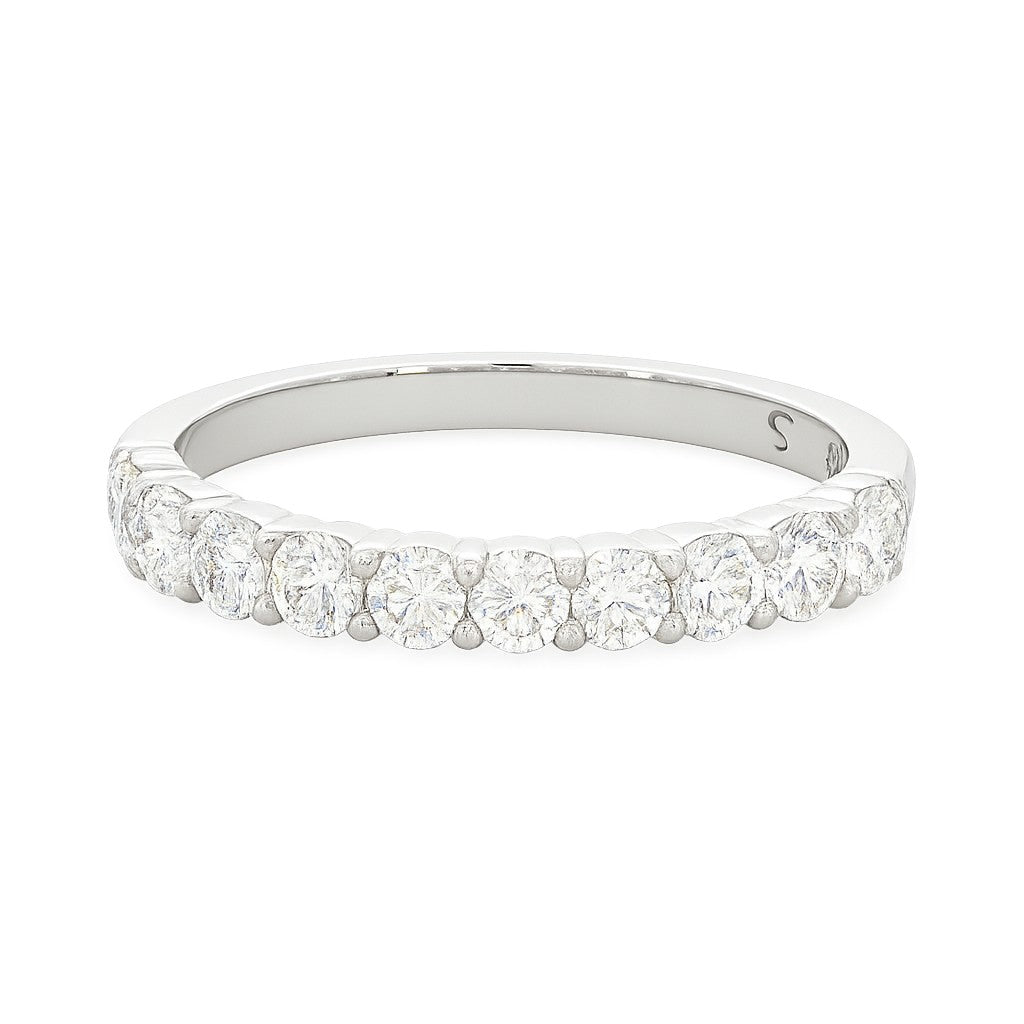 An elegant 18ct White Gold ring crafted with a timeless row of natural round brilliant diamonds, each set securely in fine prongs to create a continuous ribbon of sparkle. The polished white gold enhances the brightness of the stones, giving the band a clean, luxurious finish. Perfect as a wedding band, anniversary ring, or a classic stackable piece, it offers enduring beauty and exceptional craftsmanship in a design that never dates -18ct White Gold -Natural Diamonds -GH SI -TDW = 1ct -Size N