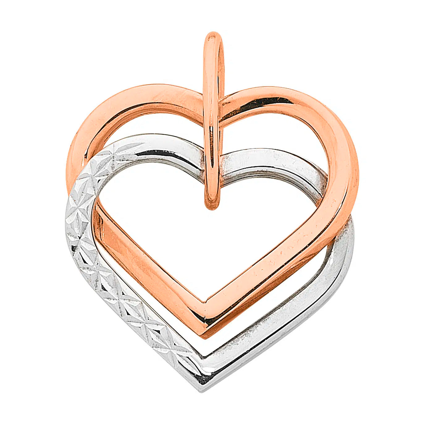 Crafted in radiant 9ct rose and white gold, this double heart pendant is a timeless symbol of love and unity. Two interlocking hearts—one warm and golden, the other sleek and luminous—create a graceful contrast that speaks to harmony and togetherness. The yellow gold heart evokes tradition and warmth, while the white gold counterpart adds a touch of modern elegance.