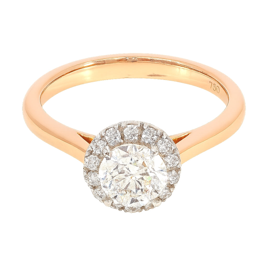 Celebrate timeless elegance with this exquisite halo design, crafted in warm 18ct rose gold. At its heart, a captivating 0.70ct Round Brilliant Cut diamond (IJ/P1) radiates brilliance and charm. Encircling the centre stone, 14 meticulously set Round Brilliant Cut diamonds enhance its fire and presence, bringing the total diamond weight to 0.80ct (IJ/P1). The harmonious blend of soft rose tones and scintillating diamonds creates a romantic silhouette—perfect for a love that deserves to be cherished forever.