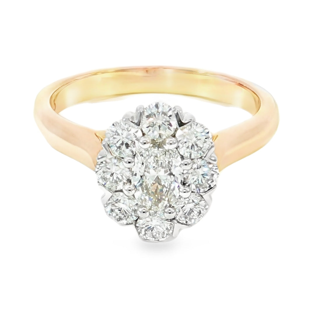 A radiant celebration of elegance and contrast, this exquisite ring pairs the warmth of 18ct rose gold with the timeless brilliance of white gold. At its heart lies a captivating 0.30ct oval diamond (GH SI), framed by a halo of eight dazzling diamonds totaling 0.70ct (GH SI). The cluster design evokes vintage charm while offering a contemporary silhouette, making it a perfect statement of enduring love or refined personal style.