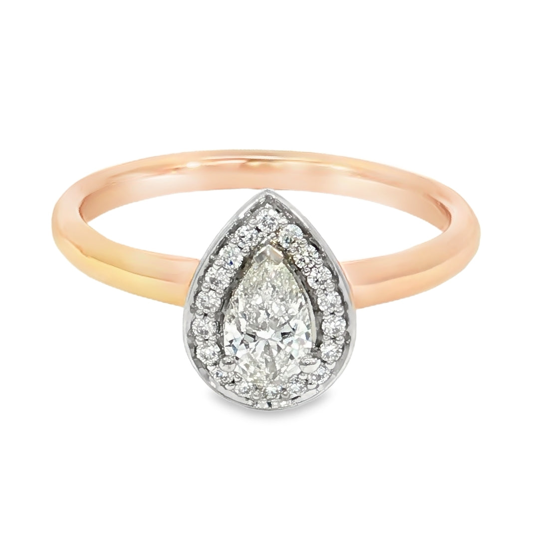 A celebration of elegance and contrast, this exquisite ring features a pear-cut diamond (0.30ct, D3-SI, H) nestled within a radiant halo of 18 round brilliant diamonds (totaling 0.09ct, D3-SI, H). The warm blush of 18ct rose gold pairs seamlessly with the cool sophistication of white gold halo setting, creating a timeless dual-tone setting that enhances the brilliance of each stone. With a total diamond weight of approximately 0.39ct, this piece offers refined sparkle and enduring charm—perfect for marking life’s most meaningful moments.