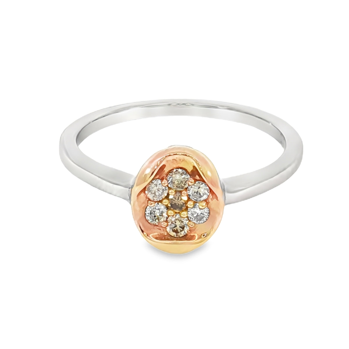From our Dreamtime Collection Crafted in 9ct white and rose gold, this elegant oval diamond ring celebrates the harmony of contrast and connection. A total diamond weight of 0.15ct adds a subtle brilliance, while the warm blush of rose gold embraces the cool sophistication of white gold. Features: • Natural diamonds responsibly sourced from the renowned Argyle Diamond Mine in Western Australia • Oval design symbolising unity and timeless elegance • 9ct white and rose gold setting for a modern yet romantic aesthetic • TDW = 0.15ct Each piece in our Dreamtime Collection honours the land, legacy, and craftsmanship that define Australian fine jewellery. Design No: DRG424.
