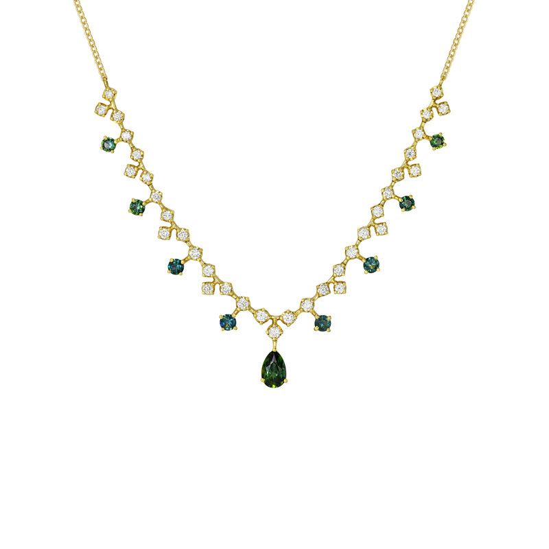 The Juniper Necklace showcases a beautiful white diamond arrangement, embellished by delicate drops of Australian sapphires. This piece is classic and luxurious, the perfect glamourous accessory.