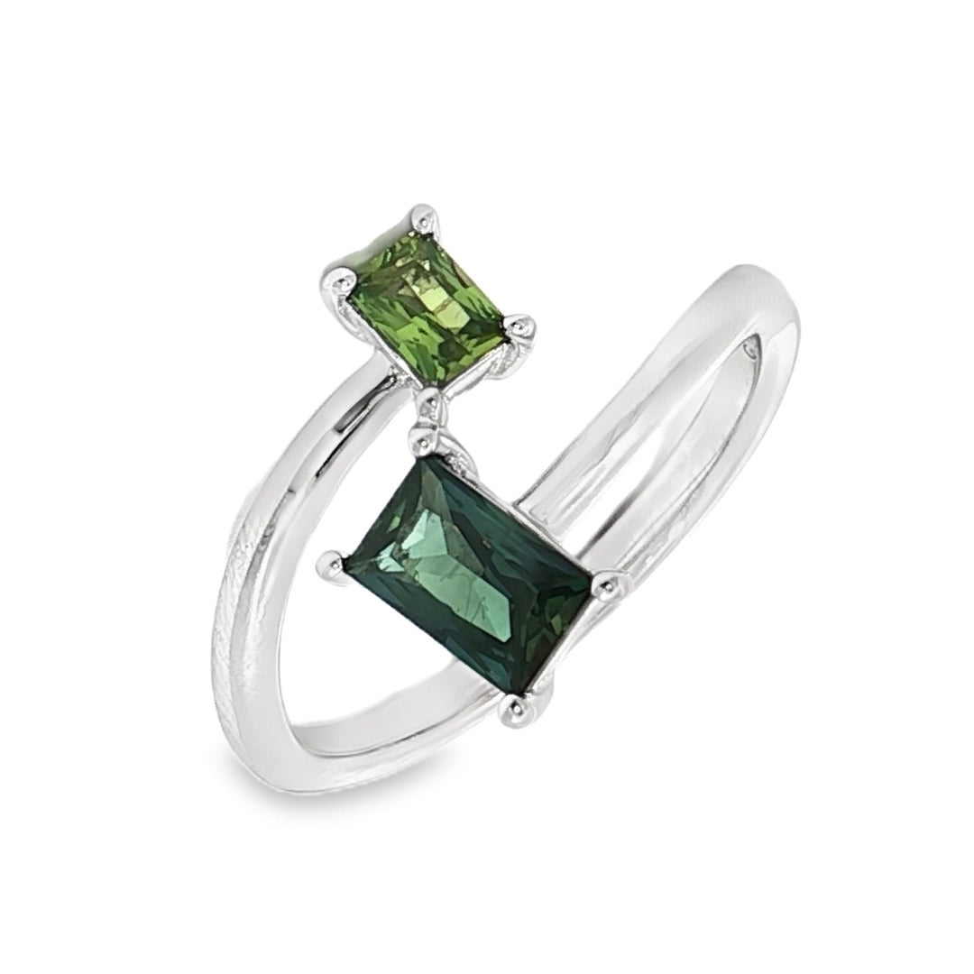 Crafted in luminous 9ct white gold (2.66g), the ARILLA Ring is a striking celebration of contrast and harmony. This bypass-style design showcases two exquisite baguette-cut natural Australian sapphires: a captivating 0.74ct teal sapphire and a vibrant 0.21ct green sapphire. Their asymmetrical placement creates a dynamic interplay of colour and form, evoking the beauty of Australia’s diverse landscapes.