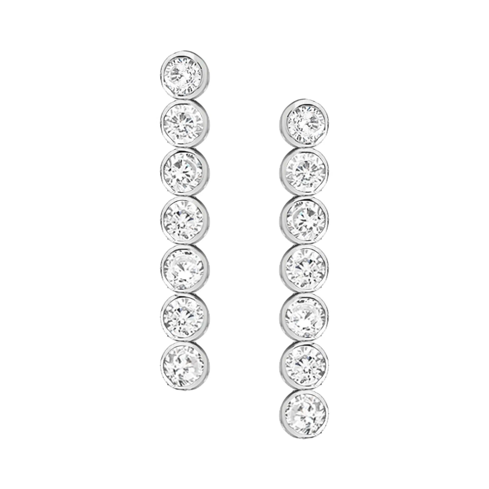 Gracefully suspended and elegantly luminous, these drop earrings feature seven bezel-set cubic zirconia stones in each earring, cascading in a linear silhouette. Crafted in radiant sterling silver, the bezel setting enhances the brilliance of each stone while offering a sleek, modern profile. The gentle movement of the drop design adds a touch of sophistication, making them perfect for both everyday elegance and evening glamour.