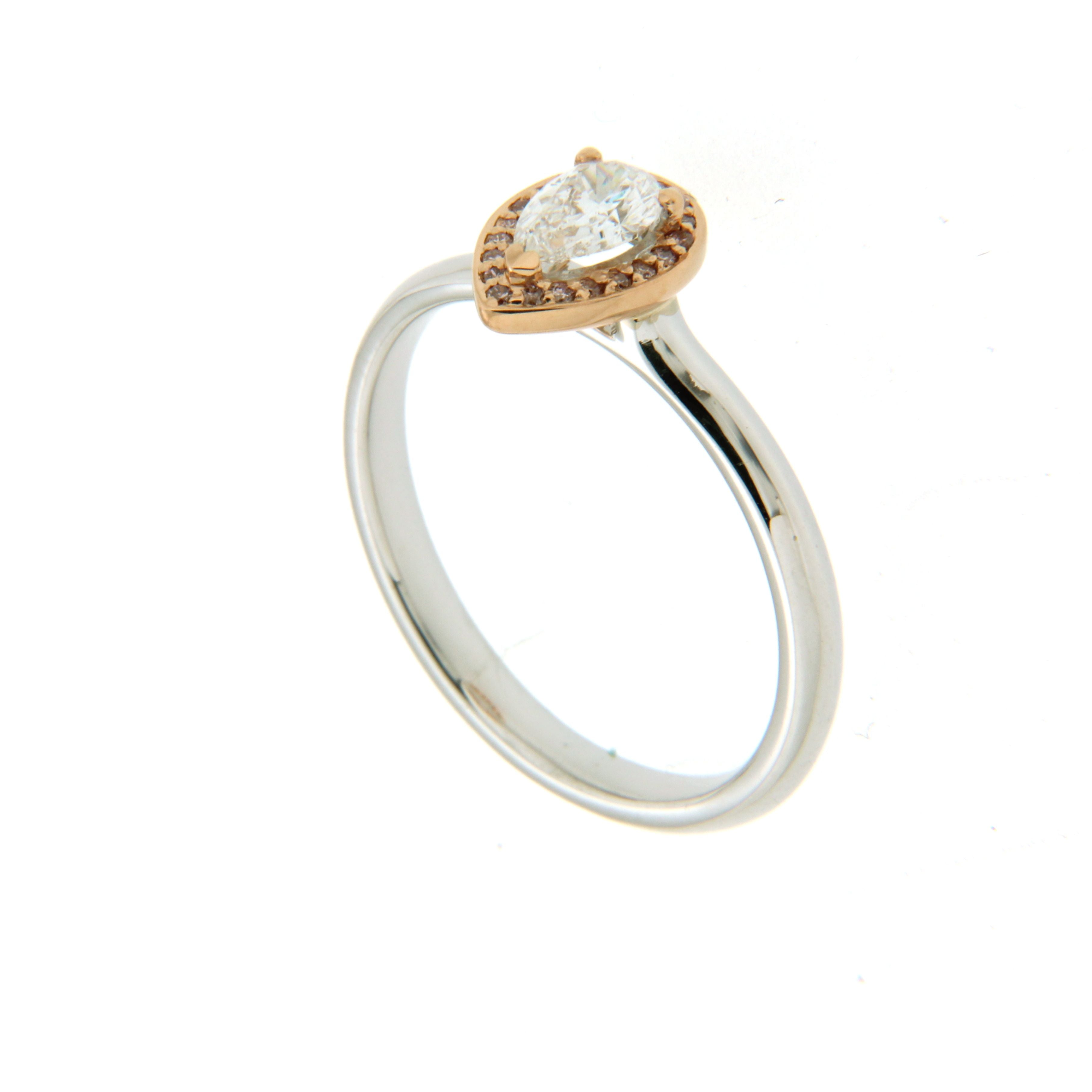 A graceful fusion of warmth and brilliance, this ring features a captivating 0.31ct pear-cut centre diamond (SI clarity, G/H colour) nestled within a delicate halo of 20 round pink diamonds totaling 0.08ct. The interplay of 18ct white and rose gold enhances the soft blush of the pink diamonds while amplifying the fire of the central stone. Designed to evoke timeless sophistication, this piece is perfect as a statement of love, legacy, or personal style.
