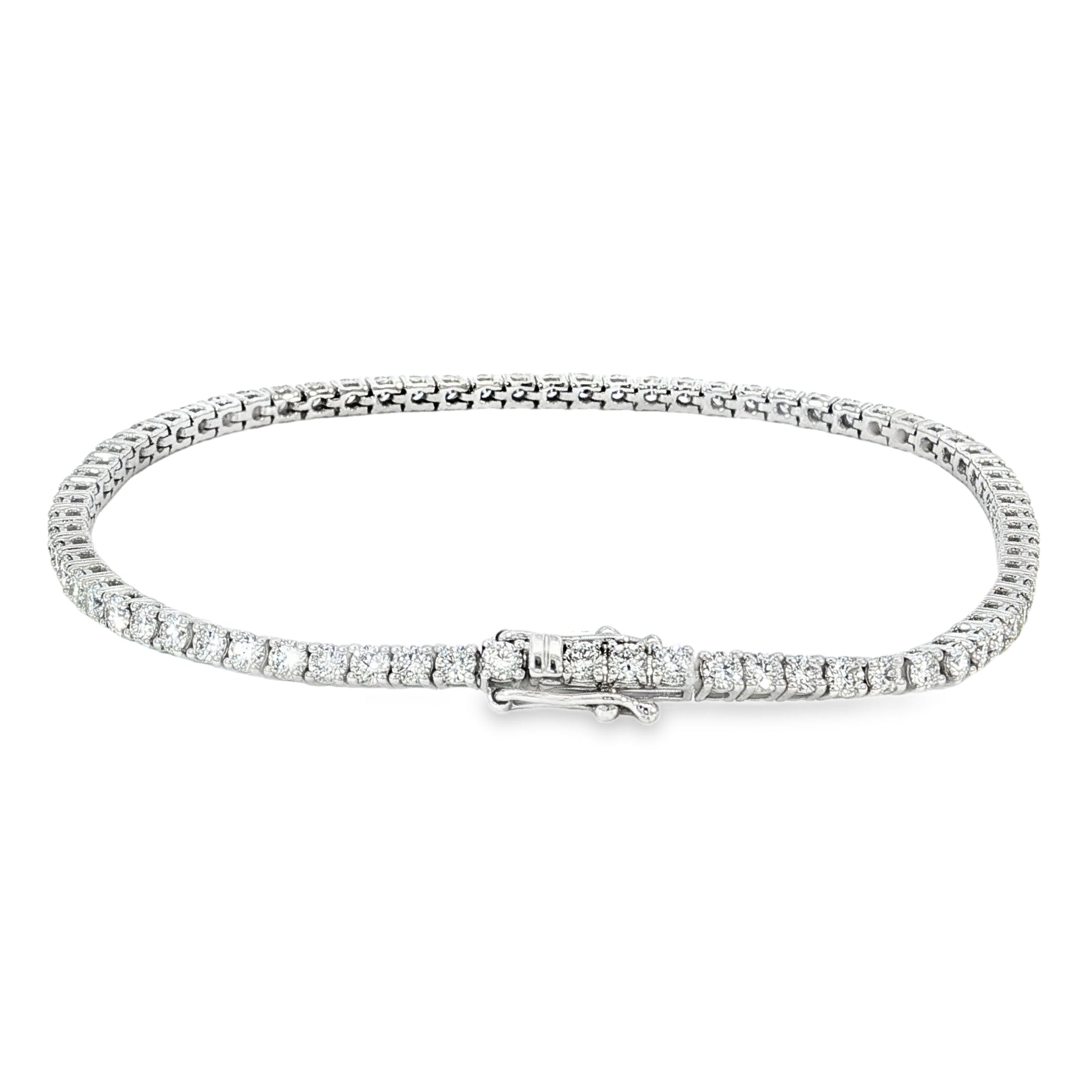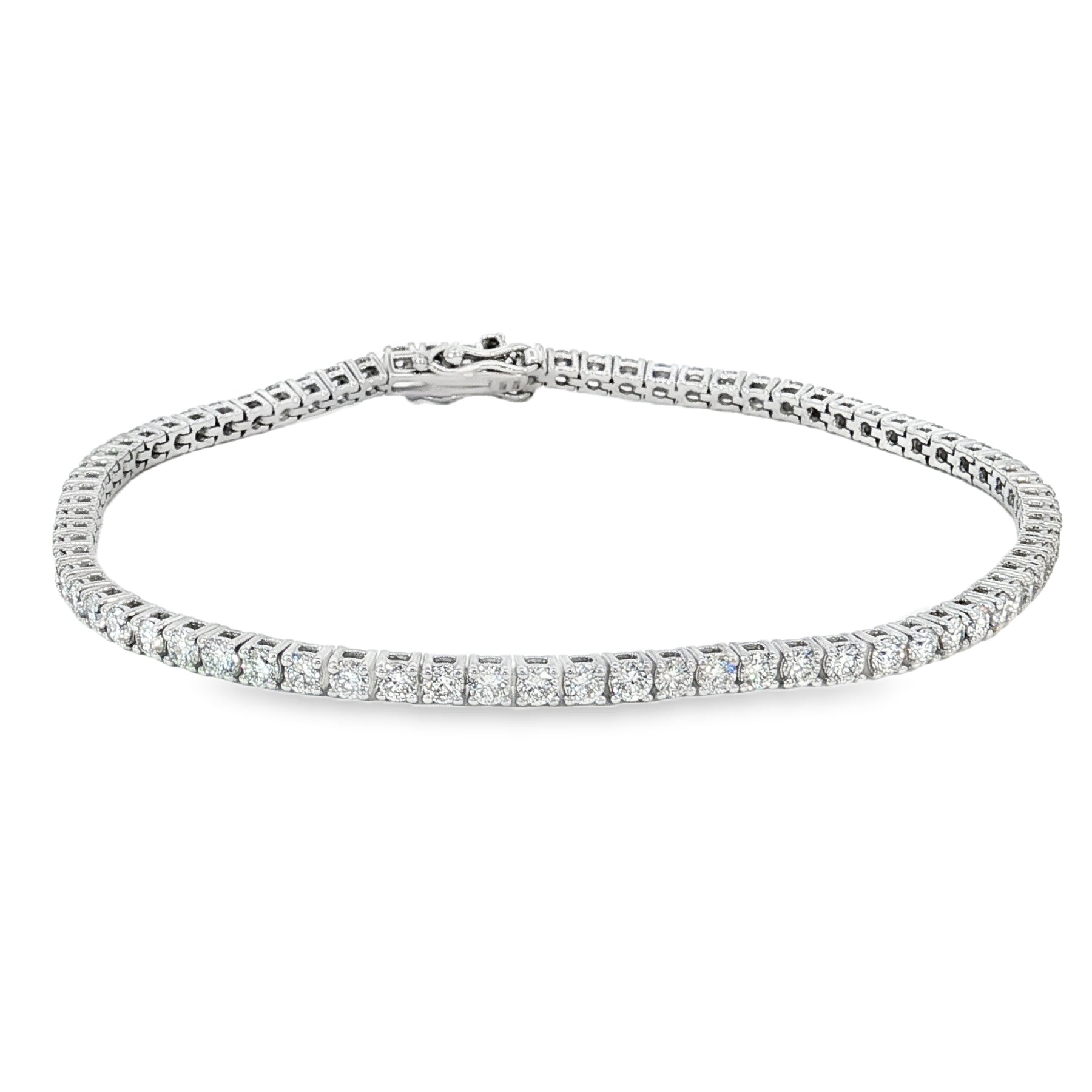 9ct White Gold Lab-Grown Diamond Bracelet – 3.03ct TDW, E/F VS A modern classic, this elegant bracelet showcases the brilliance of ethically sourced lab-grown diamonds, totaling 3.03 carats. Each stone is precision-cut to E/F color and VS clarity, delivering exceptional sparkle and purity. Set in luminous 9ct white gold, the design balances timeless sophistication with contemporary values. Ideal for those who appreciate refined craftsmanship and sustainable luxury. Design No: MBR00099-9K-WG