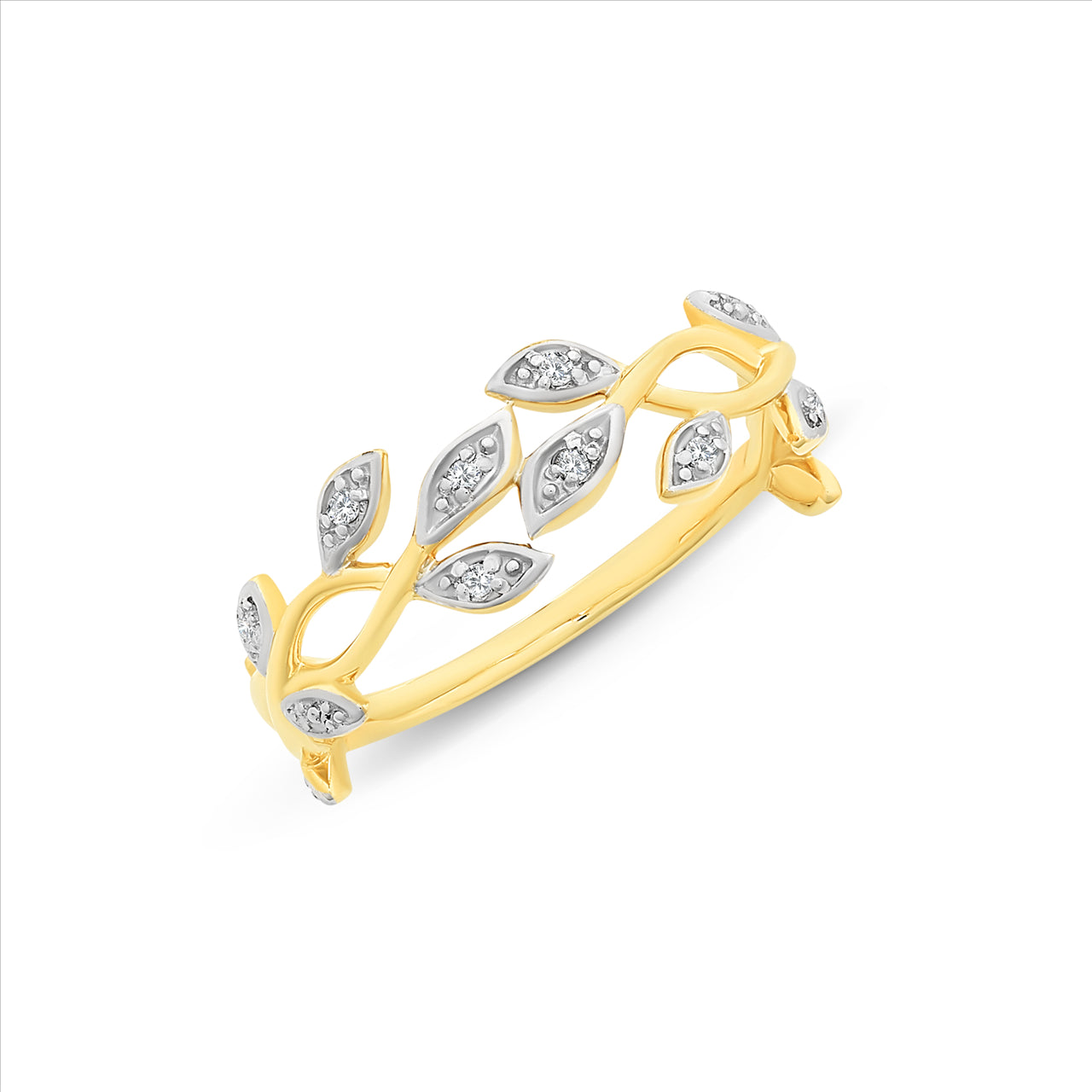 Celebrate organic elegance with this enchanting leaf motif ring, where nature meets refined artistry. Crafted in radiant yellow gold, the band is encircled by a delicate procession of stylized leaves—each one pavé-set with shimmering white stones that evoke dewdrops at dawn. The contrast of white metal settings against the warm gold enhances the brilliance of each stone, creating a luminous interplay of light and texture.