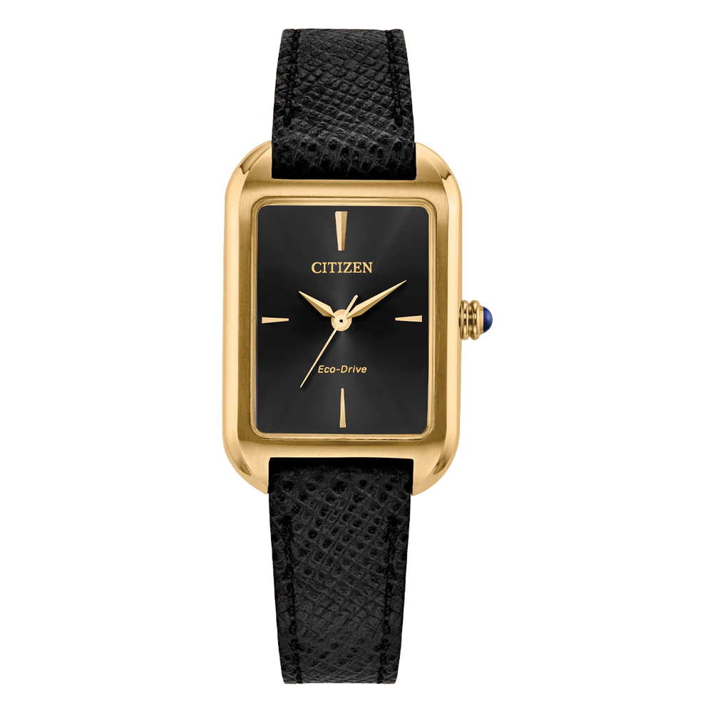 Citizen Ladies Eco-Drive stainless steel WR watch with leather strap. Design No: EM1190-06L