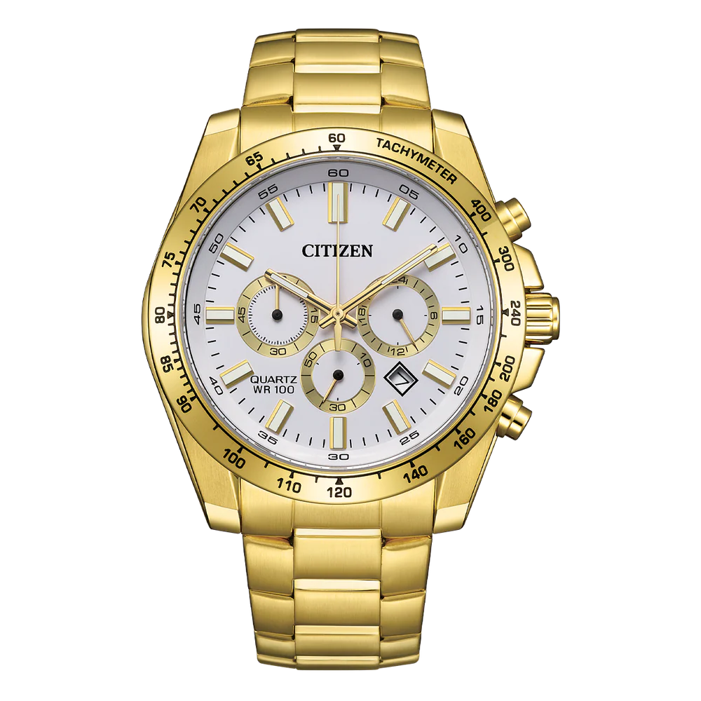 Key Features. The Citizen Quartz Men’s Sports Chronograph is the perfect blend of style, functionality, and precision. Equipped with a 1/1 second chronograph and 60-minute timing, this watch ensures you're always on top of your game. With its 24-hour time display and convenient date function, it’s built for those who value both form and performance. Crafted with a sleek gold tone stainless steel case and bracelet, complemented by a striking white dial, this timepiece isn’t just a watch – it’s a statement. The sophisticated design captures attention, making it ideal for both casual and formal occasions. Powered by Citizen’s cutting-edge Japanese Quartz movement, this chronograph promises unmatched accuracy and reliability, ensuring you can rely on it every minute of the day. Whether you're out on an adventure or in a business meeting, the Citizen Quartz Men’s Sports Chronograph keeps you punctual, stylish, and ahead of the curve. Collection: Dress Technology: Quartz Case Material: Stainless Steel Dial: White Case Size (MM): 44 Band: Bracelet Water resistance: WR100/10Bar [Swimming / Snorkeling] Functions: Calibre 520, Multi Dial, Chronograph, Date. Model No: AN8232-53A.