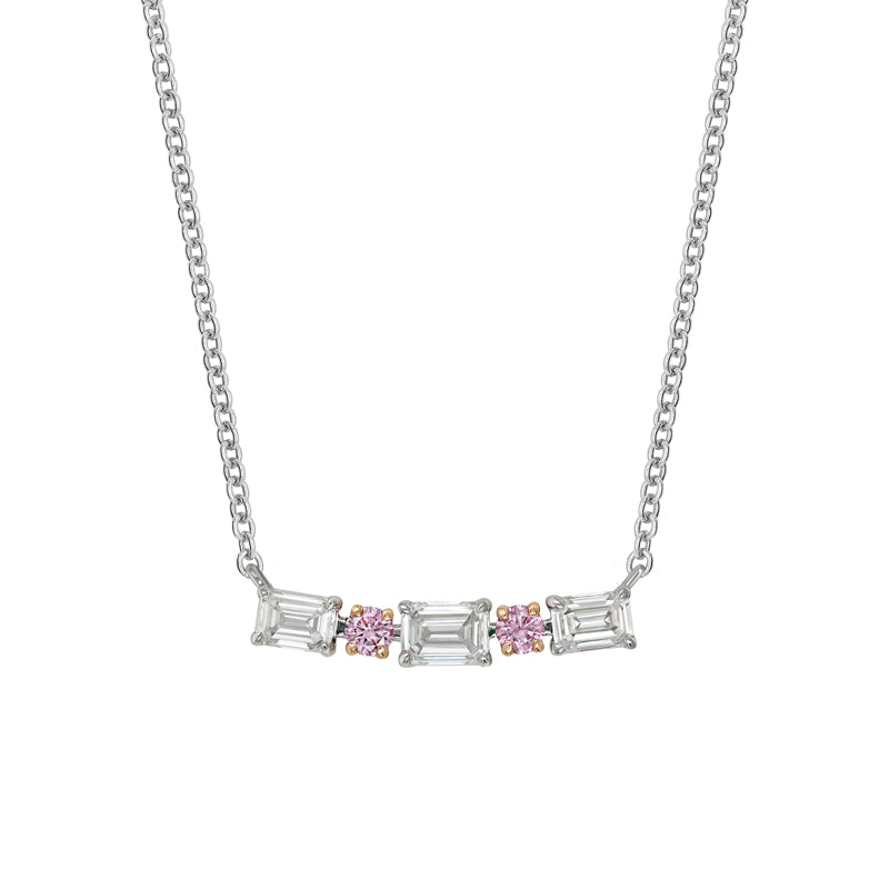 The Kimberley Cinque Emerald Necklace is a refined statement of modern elegance. Featuring a graceful alignment of rare Argyle pink round diamonds and brilliant white baguette cuts, this design celebrates harmony in contrast. Crafted in 18ct rose and white gold, the necklace is suspended on a classic white gold chain, adding a contemporary sparkle to your jewellery collection. A sophisticated piece for everyday luxury, infused with the rarity of Australian pink diamonds.