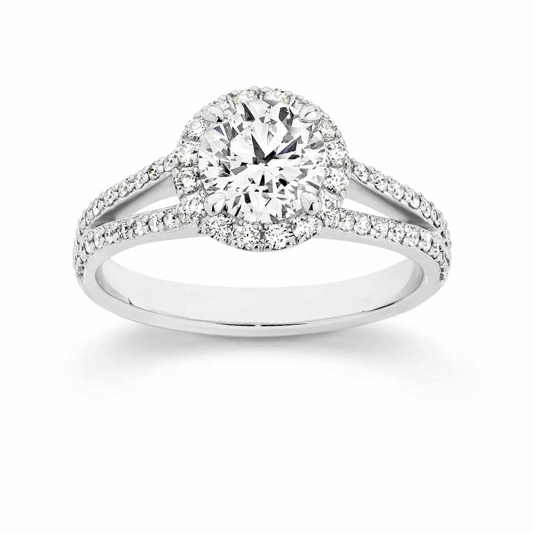 18ct White Gold Halo Split Shank Diamond Engagement Ring.