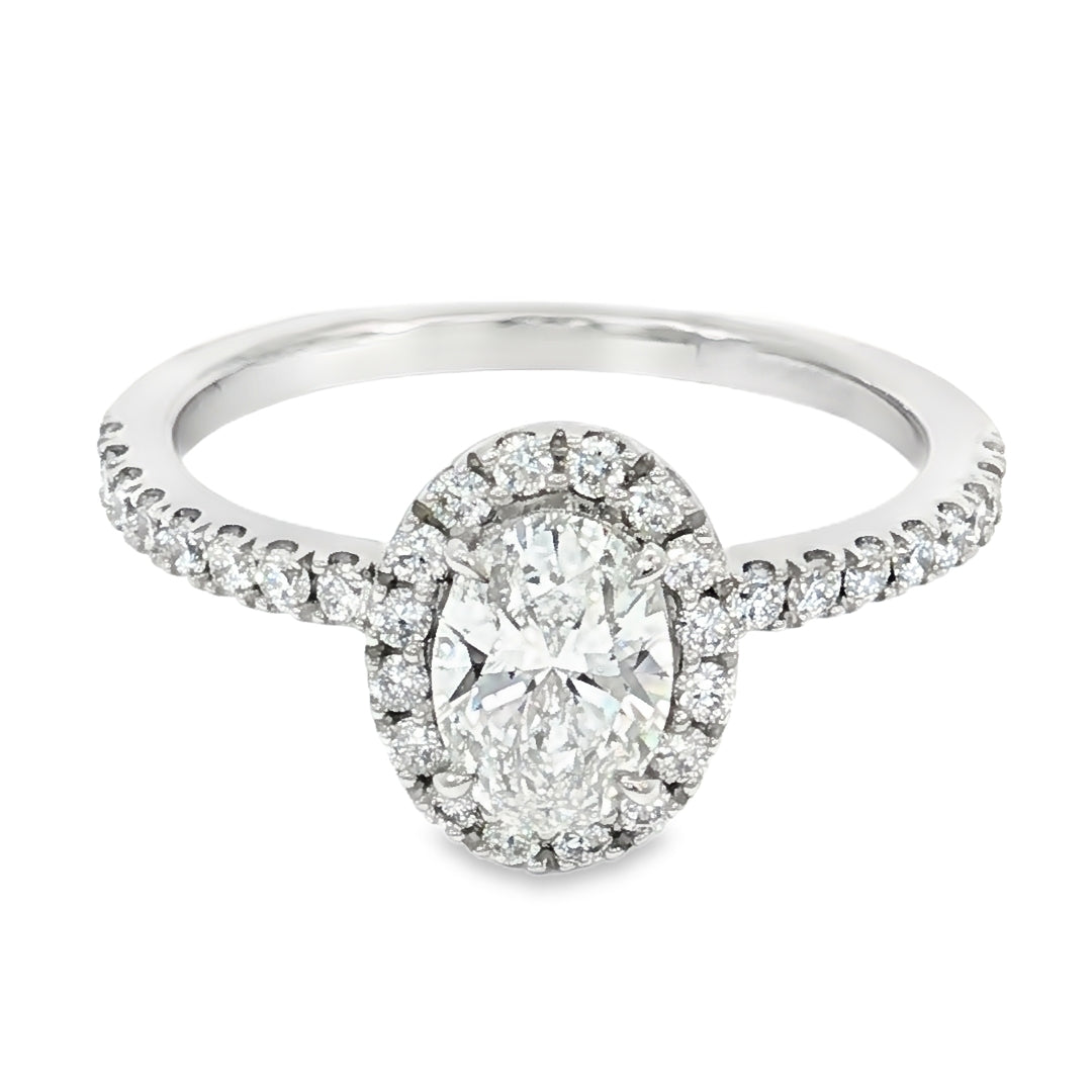 A modern heirloom crafted in luminous 18ct white gold, this elegant ring showcases a captivating 0.70ct oval lab grown diamond at its center—an ethical brilliance that commands attention. Surrounding it, a constellation of 34 accent stones (16=0.14ct, 18=0.22ct) adds delicate sparkle and dimension, bringing the total diamond weight to approximately 1.06ct.