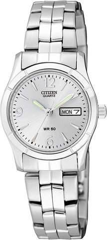 This Citizen ladies' dress watch has an classic, pure and sophisticated appearance with a silver-hued dial displaying markings in relief. The slim, durable stainless steel case and bracelet contribute to the streamlined presentation of this demure accessory. Featuring quality quartz accuracy, a three-year battery, day/date display and water resistance suitable for still water swimming, this timepiece provides the necessary functions and dependability you expect of a modern watch.