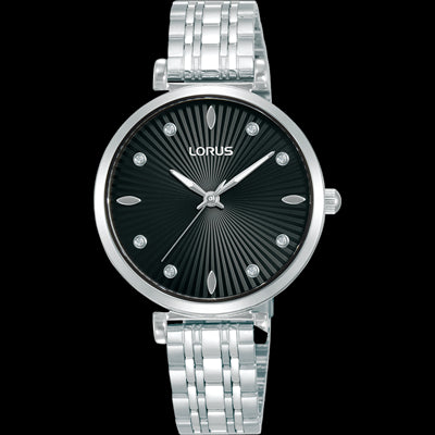 The Lorus RG255XX-9 is a stylish women's dress watch that blends classic elegance with modern flair. It features a 32mm stainless steel case and a matching silver bracelet, paired with a black sunray dial accented by eight crystal hour markers for a touch of sparkle.