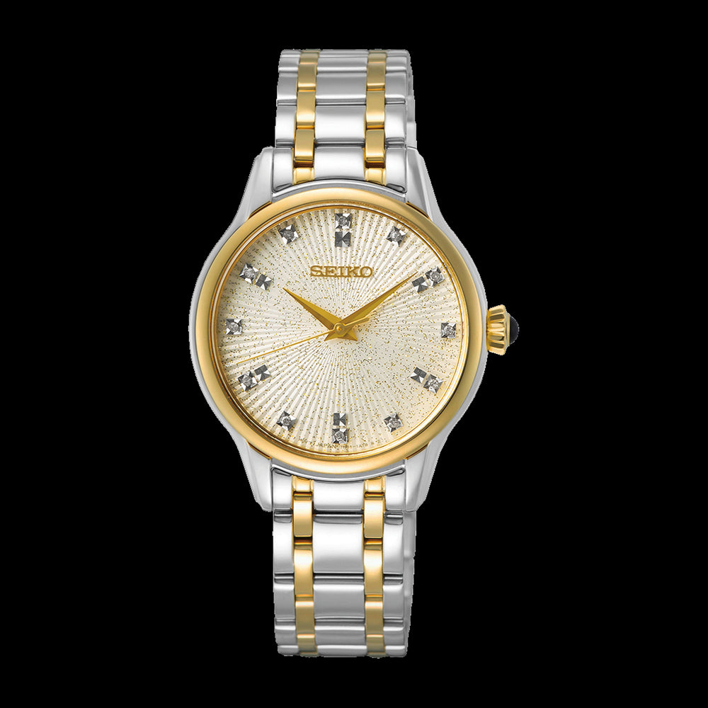 The Seiko SRZ550P is a refined ladies' timepiece that blends elegance with everyday practicality. It features a 29.5mm stainless steel case with a slim 6.3mm profile, accented by a two-tone silver and yellow gold finish. The cream-colored dial sparkles subtly and is adorned with 12 diamond hour markers, adding a touch of luxury.