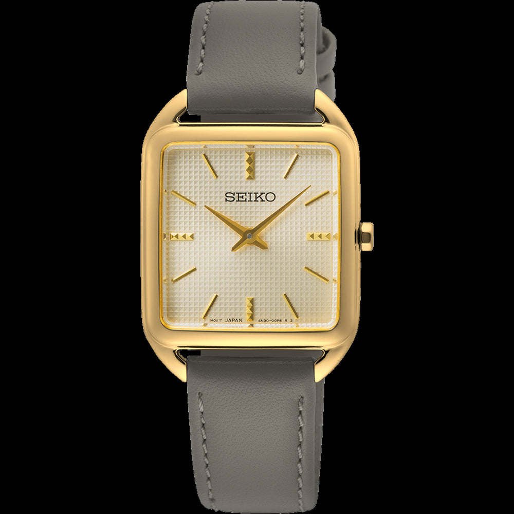 The Seiko Ladies SWR090P is a beautifully refined timepiece that blends classic elegance with modern simplicity. It features a square gold-tone stainless steel case paired with a soft grey leather strap, giving it a chic, minimalist look that’s perfect for both everyday wear and special occasions.