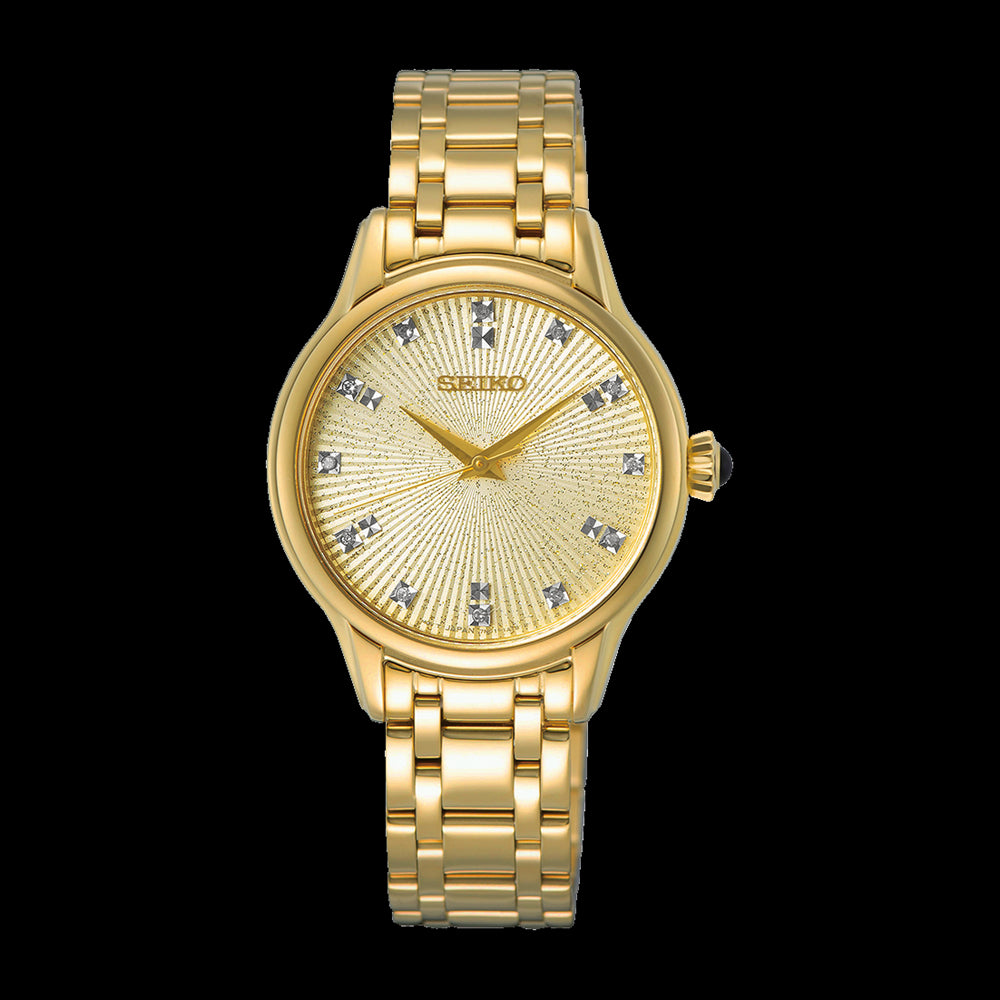 The Seiko SRZ552P is a refined ladies' timepiece that blends elegance with everyday practicality. It features a 29.5mm gold-tone stainless steel case and bracelet, giving it a luxurious yet timeless appeal. The champagne dial sparkles subtly and is adorned with 12 genuine diamonds, adding a touch of glamour without being over the top.