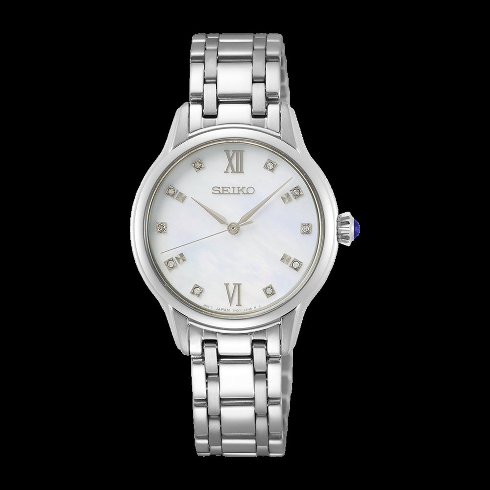 The Seiko SRZ537P is a refined ladies' dress watch that blends elegance with everyday practicality. It features a 29.5mm stainless steel case and bracelet, complemented by a mother-of-pearl dial adorned with diamond hour markers. Roman numerals mark the 6 and 12 o’clock positions, adding a classic touch.