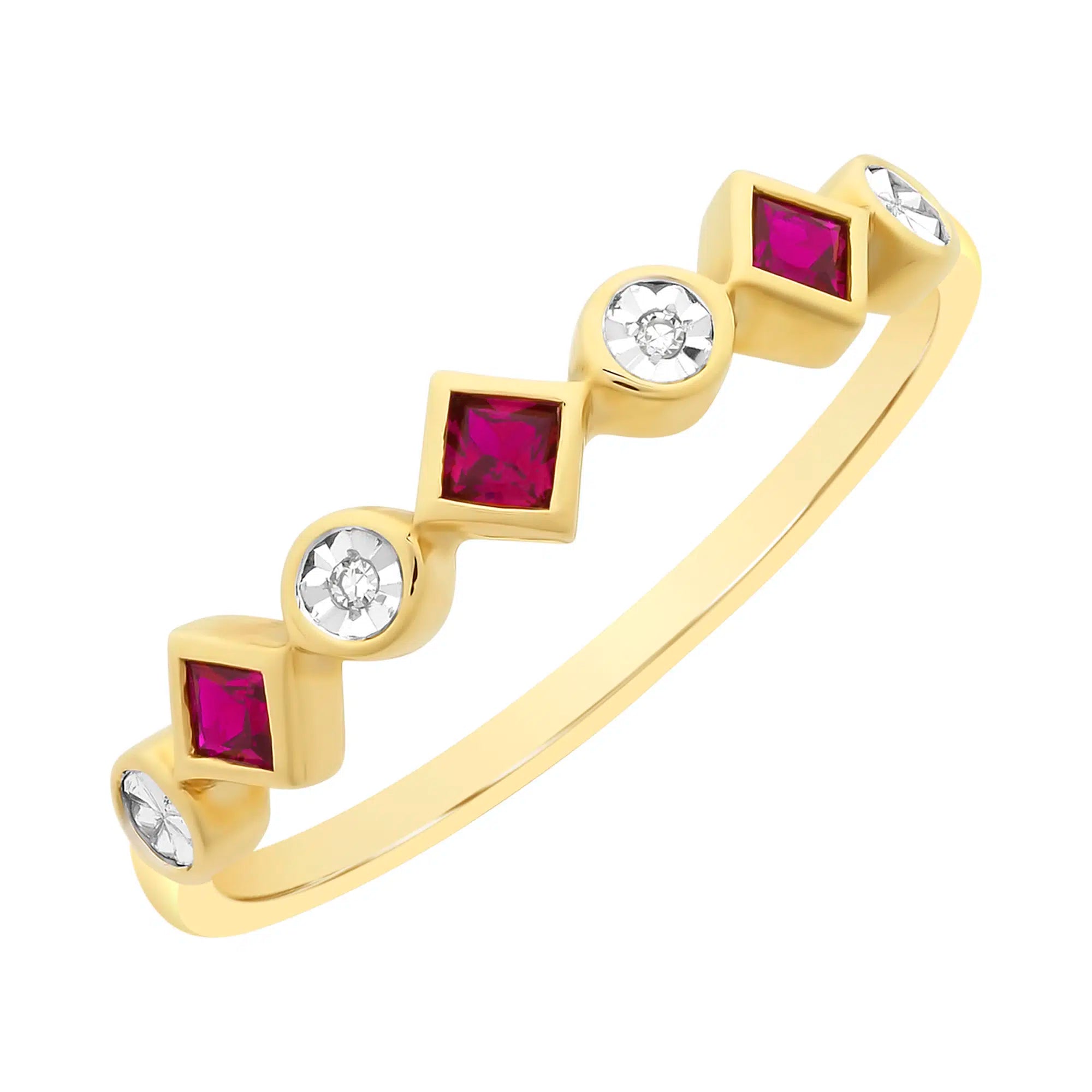 9ct Yellow Gold Created Ruby & Diamond Ring – Triple Square Elegance