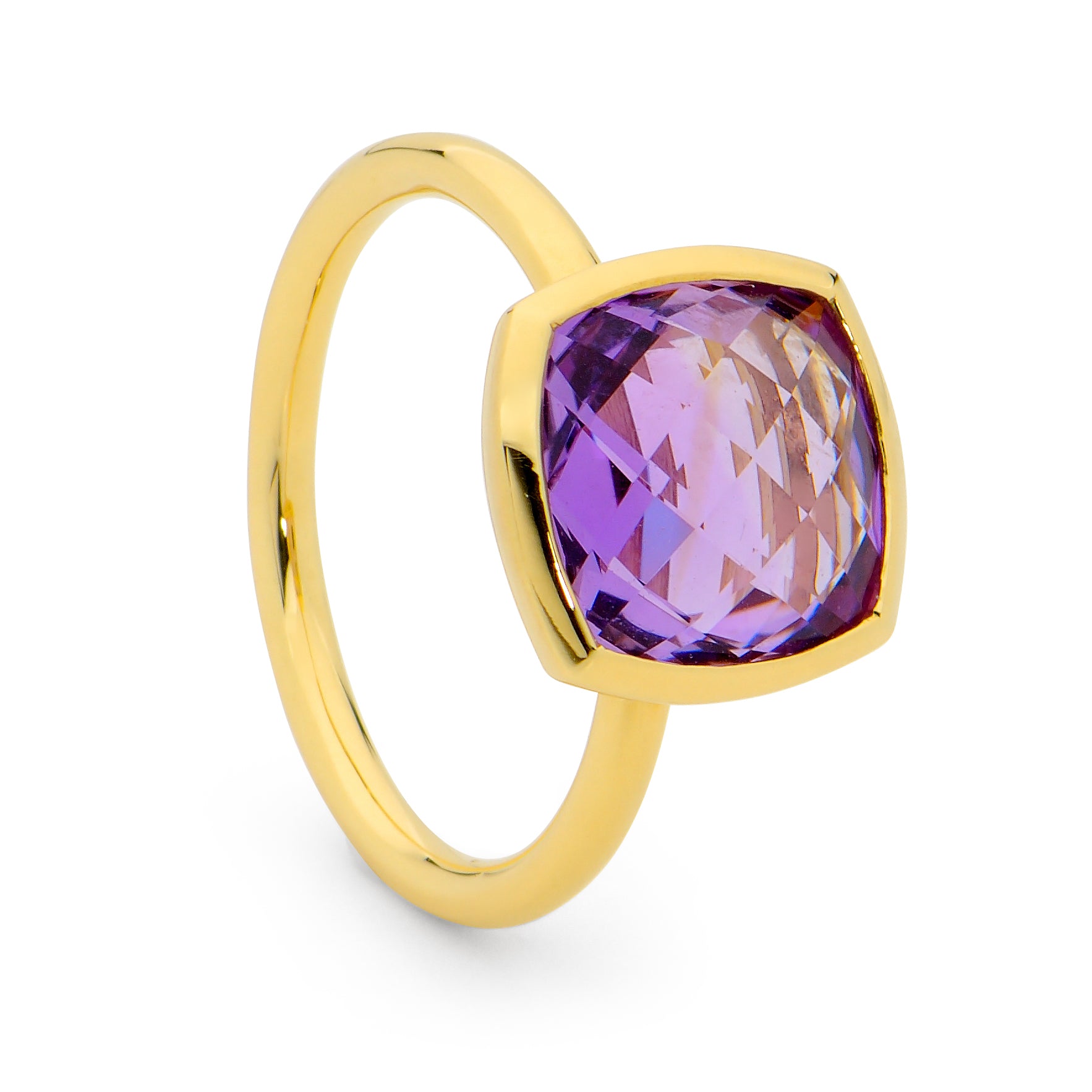Crafted in luminous 9ct yellow gold, this elegant ring showcases a single 10mm cushion-cut amethyst—its double checkerboard facets catching light with every movement. The gemstone is securely embraced in a smooth bezel setting, offering both modern refinement and timeless durability. A gently rounded shank ensures comfort and balance, making this piece ideal for everyday wear or special occasions.
