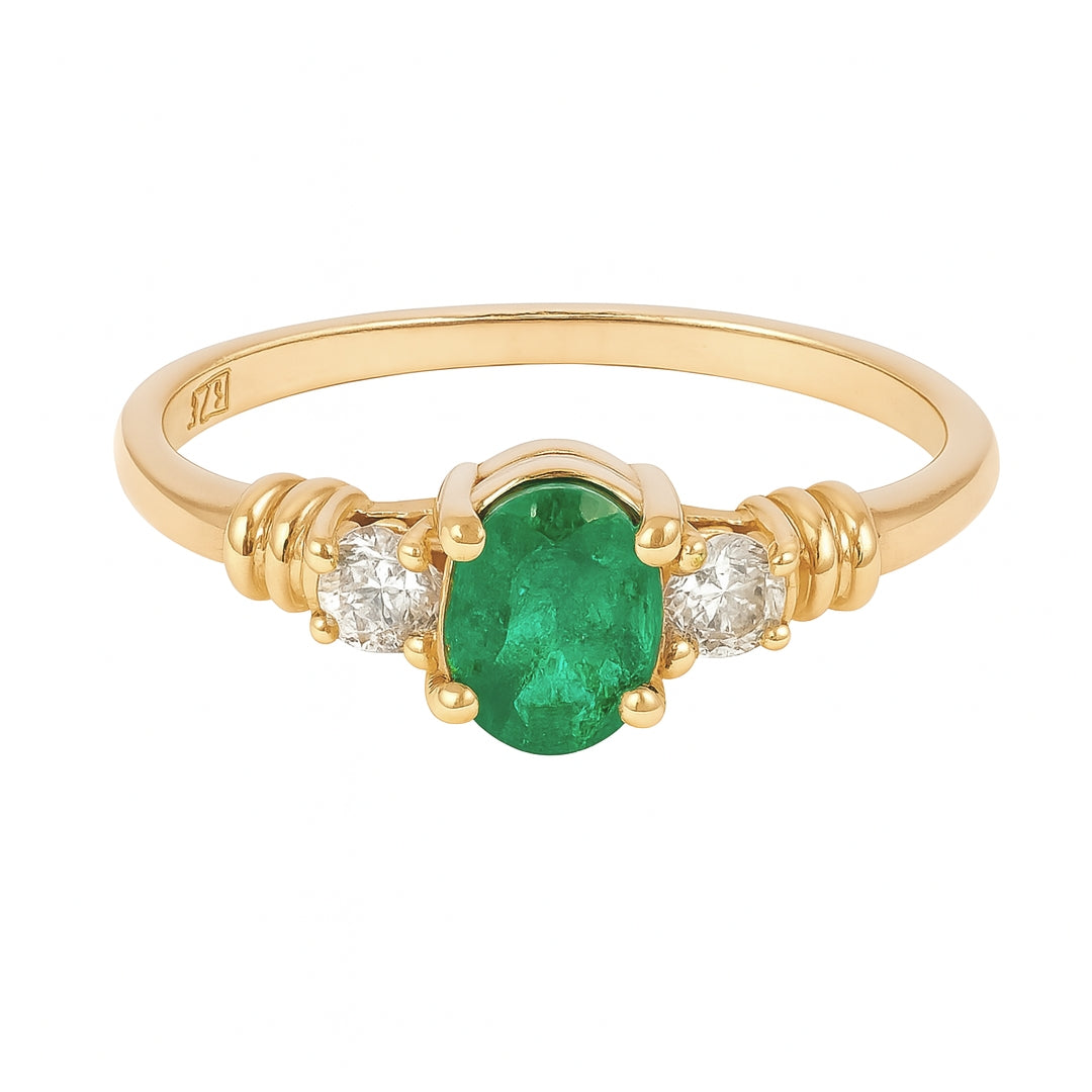 Crafted in warm 9K yellow gold, this elegant ring showcases a vivid oval-cut natural emerald, securely nestled in a classic four-claw setting. Flanking the emerald are two brilliant-cut diamonds, each weighing approximately 0.05ct, graded SI3 clarity and JKL colour, offering a soft sparkle that complements the emerald’s lush green hue.