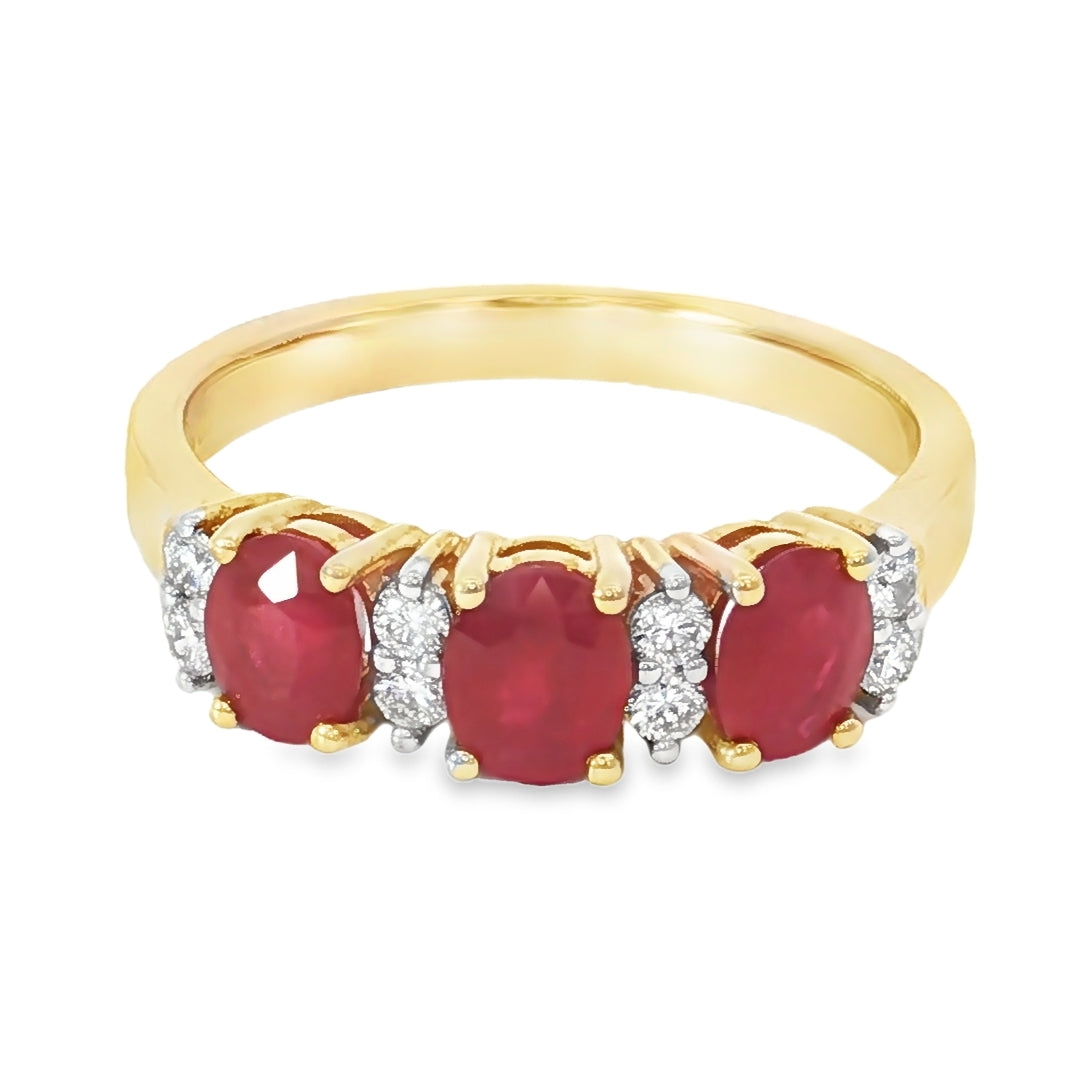 A radiant celebration of timeless elegance, this 9ct yellow gold ring showcases three vivid oval-cut rubies (5x4mm), each selected for their rich hue and Grade E brilliance. With a combined ruby weight of approximately 1.23 carats, the center stones evoke warmth and passion, beautifully complemented by eight delicate diamonds totaling approximately 0.18 carats. The diamonds, set with precision, add a refined sparkle that enhances the ring’s classic silhouette.