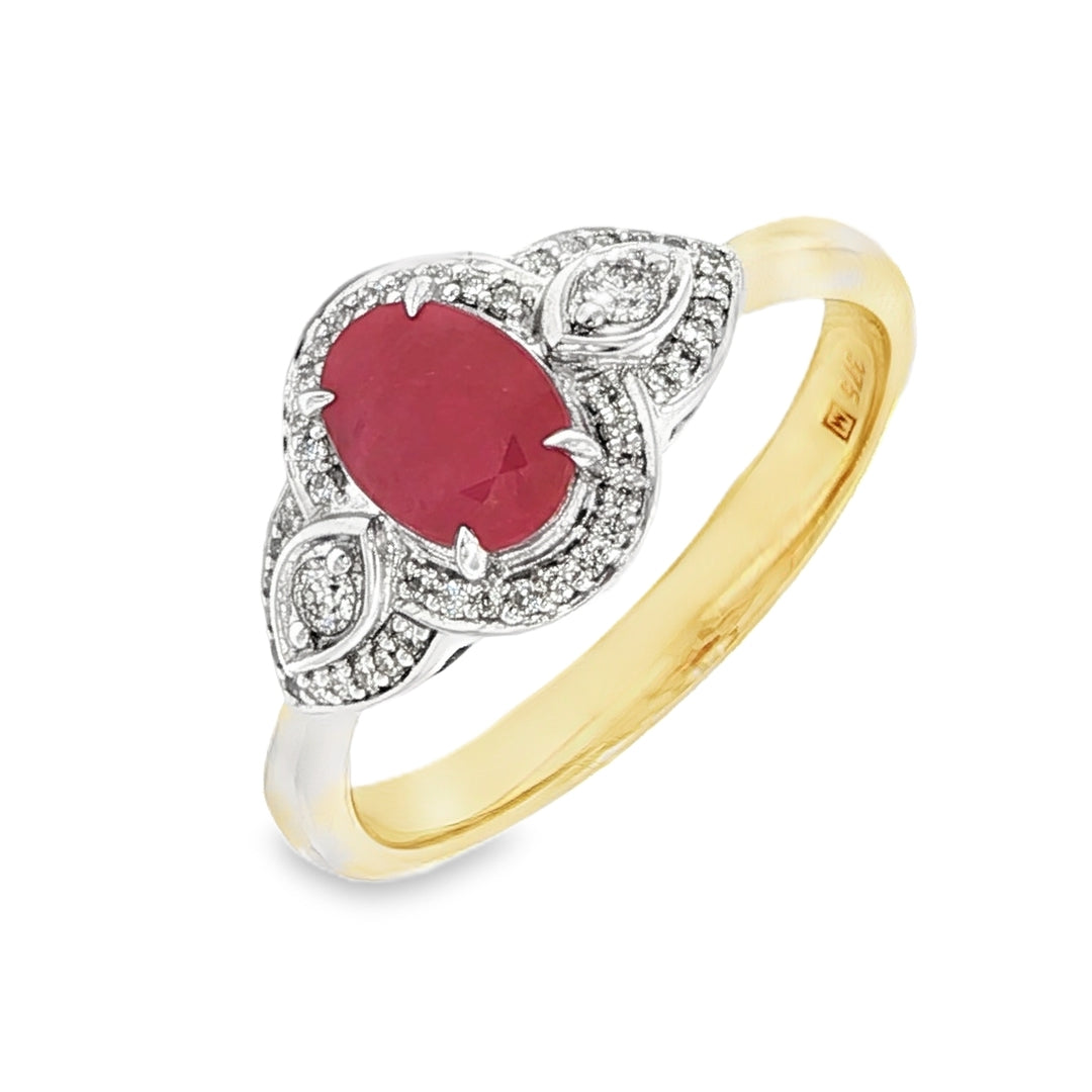 A timeless expression of elegance, this 9ct yellow gold ring showcases a captivating 7x5mm oval-cut ruby of Grade E, radiating warmth and sophistication. The central ruby, weighing approximately 1.08ct, is flanked by two accent diamonds (0.05ct) and encircled by 44 brilliant-cut diamonds (0.12ct), creating a dazzling halo effect. With a total diamond weight of approximately 0.17ct, this piece blends classic charm with refined sparkle—perfect for marking a special moment or elevating everyday style.