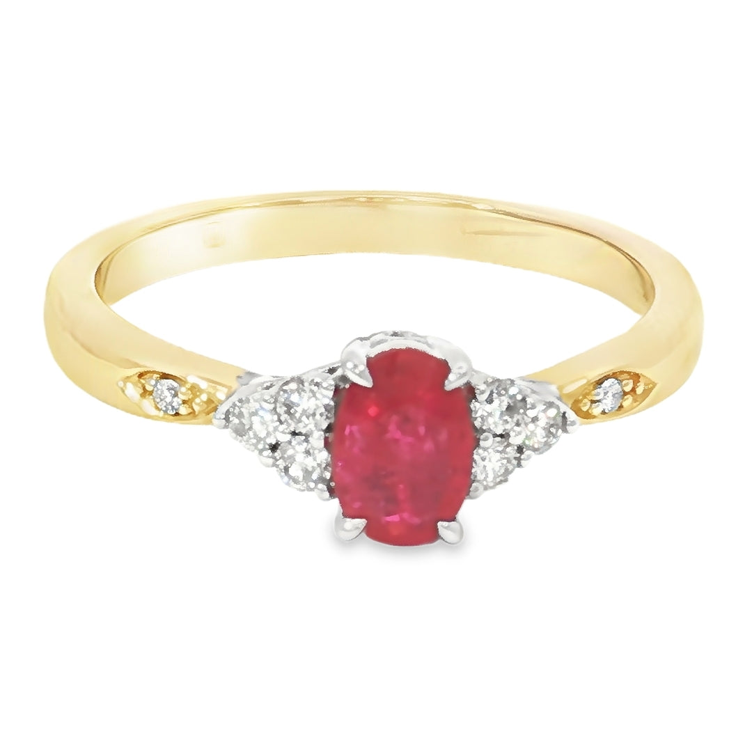 Celebrate timeless elegance with this refined 9ct yellow gold ring, featuring a vivid 6x4mm oval-cut ruby of Grade E quality. The ruby’s rich crimson hue is beautifully complemented by a delicate arrangement of eight brilliant-cut diamonds, totaling 0.15 carats (TDW). Each diamond is precisely set to enhance the ruby’s natural allure, creating a harmonious balance of fire and sophistication.
