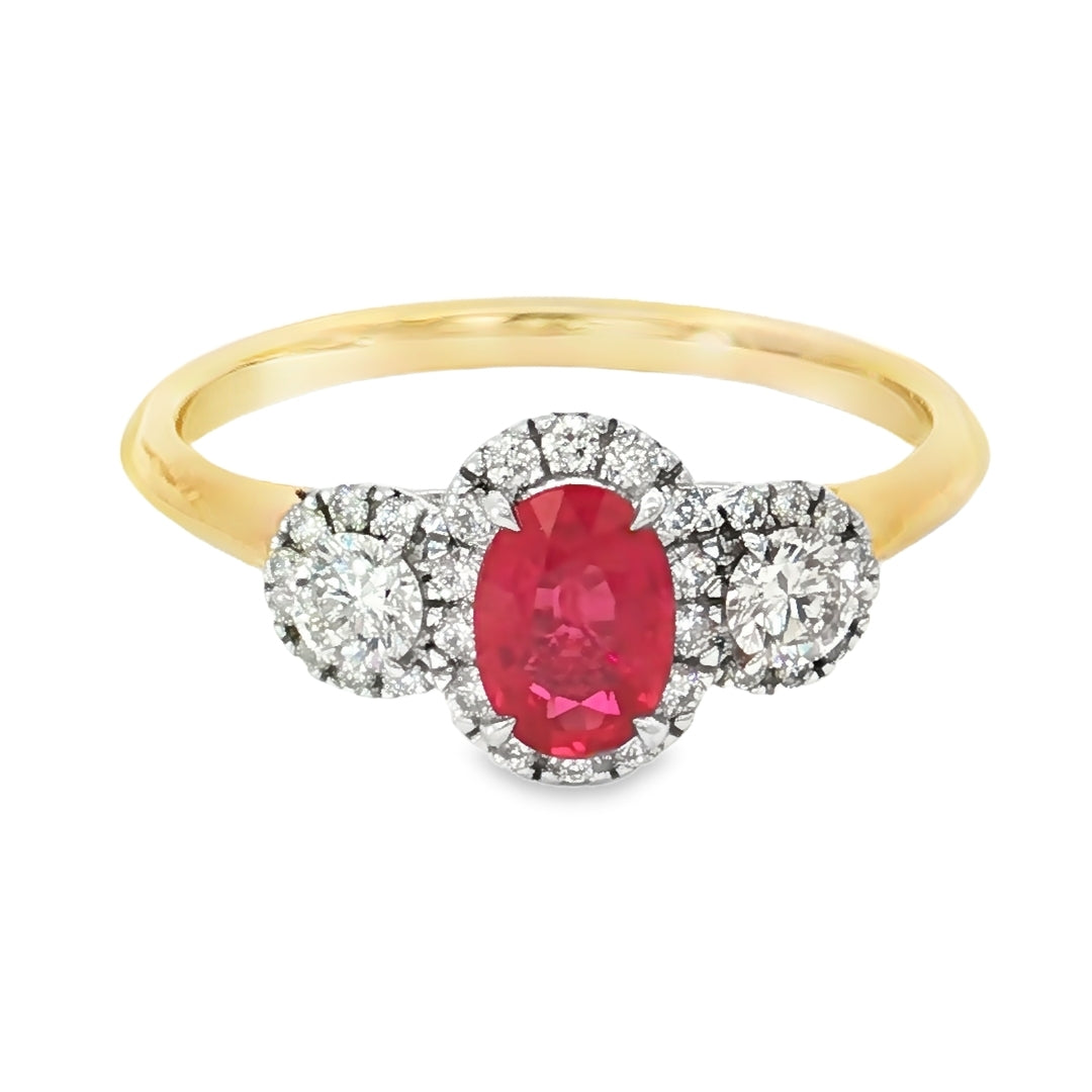 A celebration of timeless elegance and vibrant contrast, this exquisite ring is crafted in 9ct multi-coloured gold—melding the warmth of yellow gold with the cool sophistication of white gold. At its heart lies a radiant ruby, symbolizing passion and vitality, claw-set to showcase its fiery hue and natural brilliance.