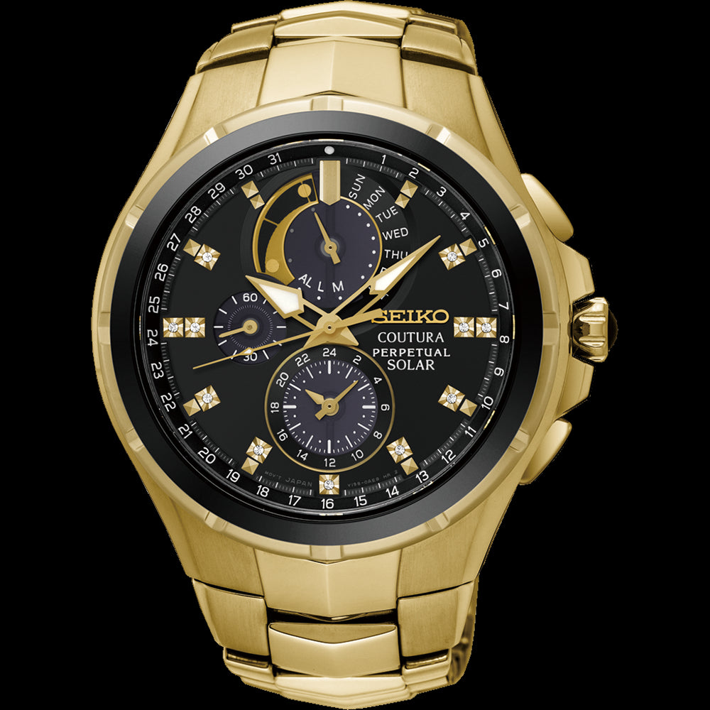 The Seiko SSC572P is a standout piece from the Coutura collection, blending sporty elegance with cutting-edge solar technology. It features a 44mm gold-tone stainless steel case and bracelet, paired with a striking black dial set with 11 diamonds for a touch of luxury.