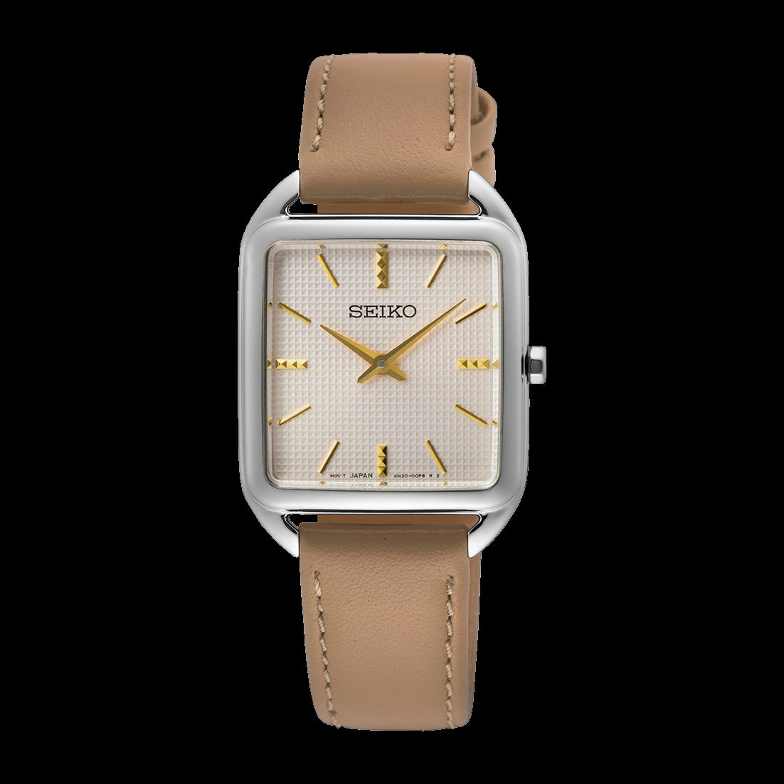 The Seiko SWR089P is a refined and minimalist ladies' timepiece from the Conceptual collection, blending elegance with everyday practicality. It features a 26mm stainless steel case with a slim 6.4mm profile, paired with a soft beige leather strap for a classic look. The dial is a clean white analogue display with two-hand movement, protected by durable Hardlex glass.